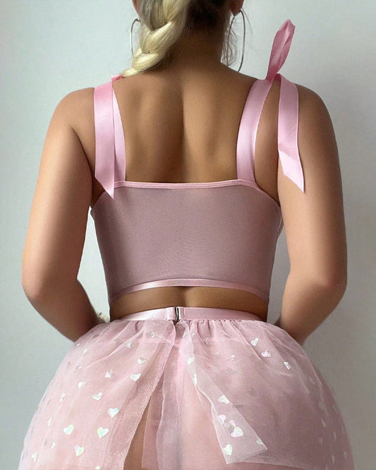 Heart-Shaped Sheer Mesh and 3D Flower Decorative Pajama Set with Fishnet Socks