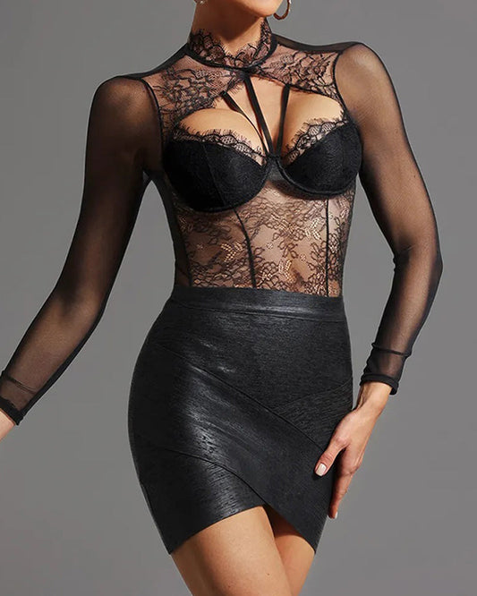 Sexy Lace See-through Mesh Long-sleeved Bodysuit