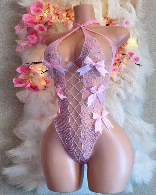 Sexy Halter Neck Openwork Mesh Bow-Decorated Bodysuit