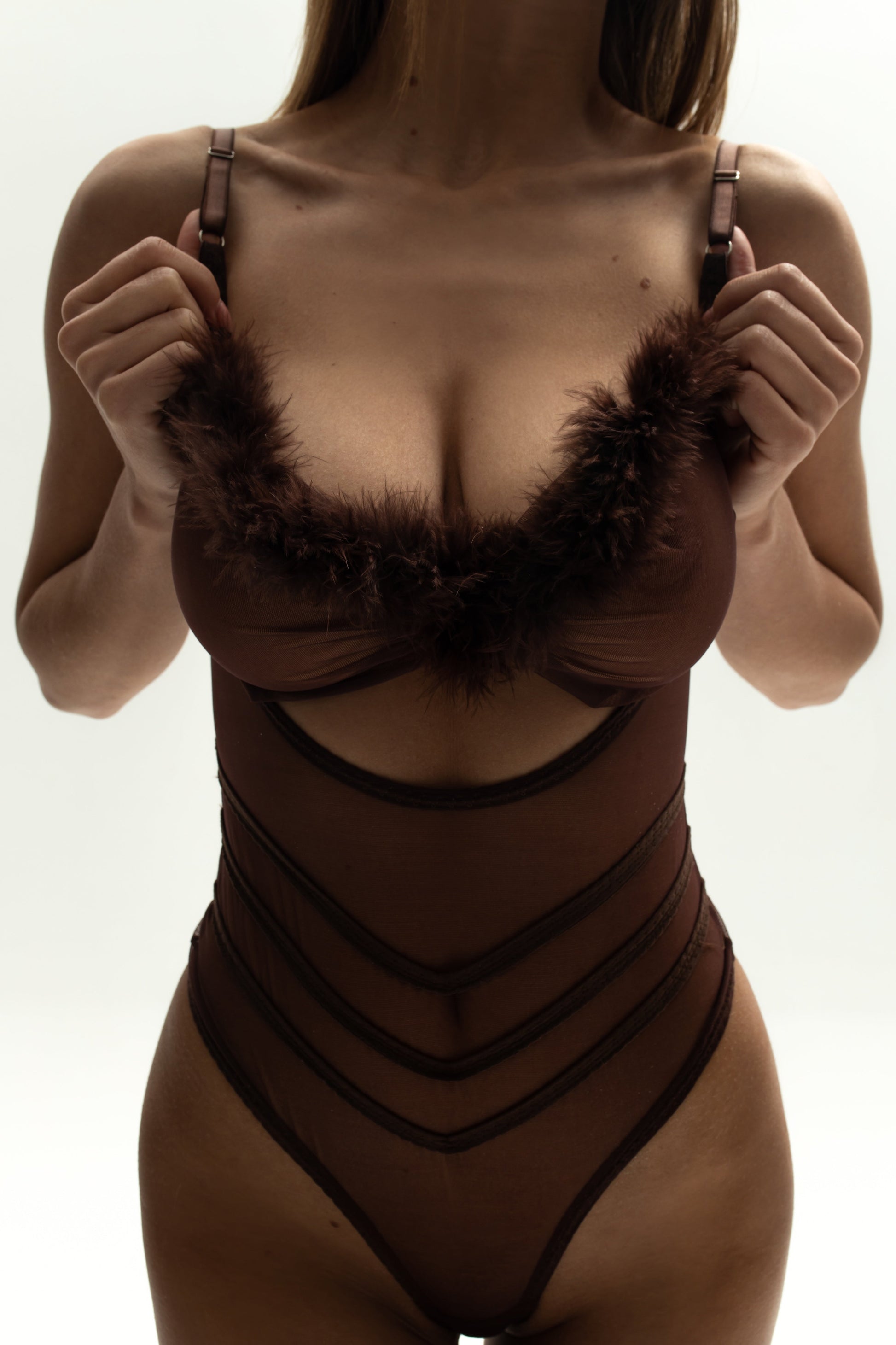 Elastic mesh bodysuit with feathers, bikini briefs.