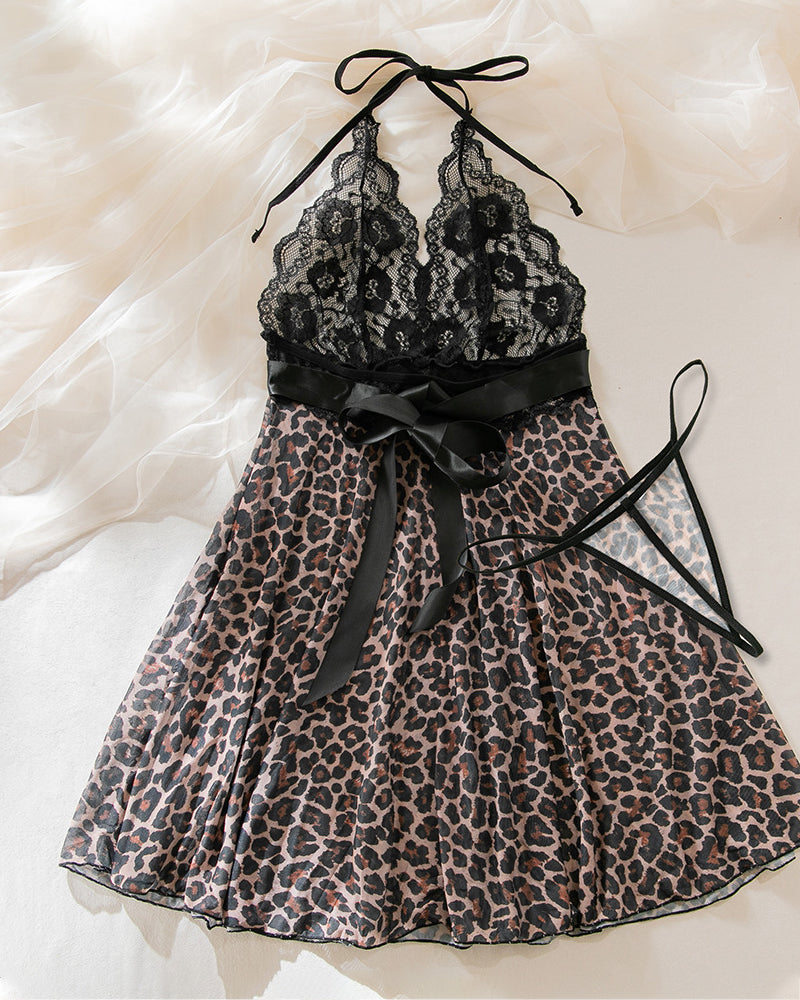 Unleash your wild side with this fierce nightwear set. The deep V-neckline flows into a bold leopard print on sheer mesh, accented with delicate lace trim for a provocative yet elegant look. Perfect for romantic evenings or confident lounging, this set blends daring style with luxurious comfort.