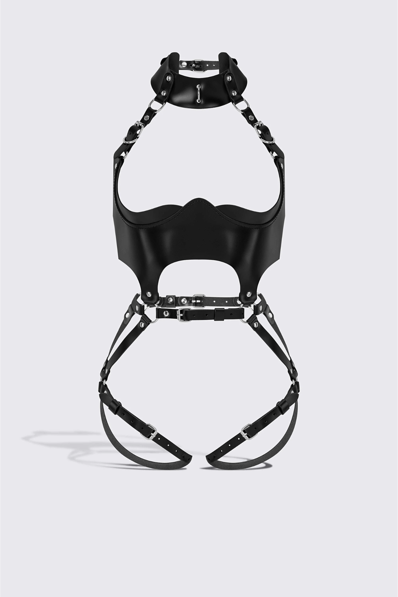Crafted from sleek faux leather with bold metal hardware, this harness bodysuit is all edge, all attitude. It doesn’t whisper — it commands.