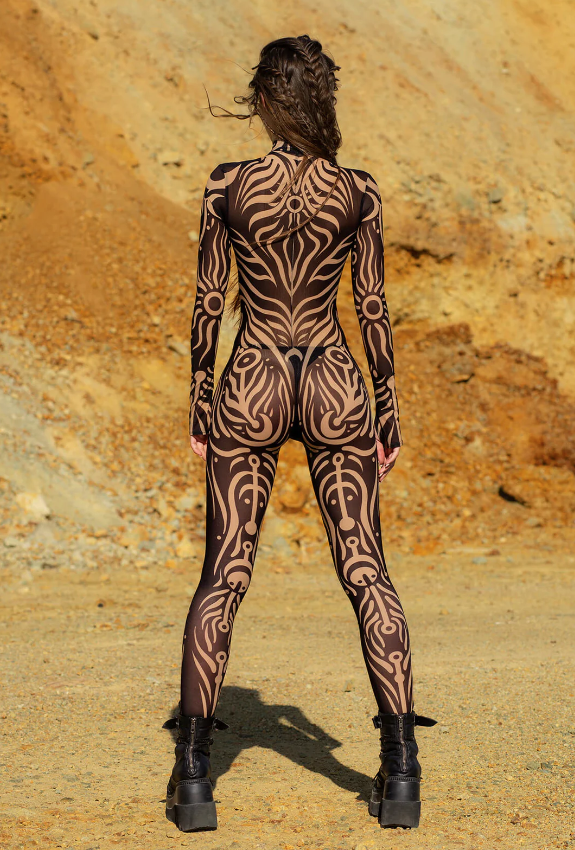 Step into the sacred sands with the Dune Empress — a full-body mesh bodysuit designed to awaken your inner goddess. Adorned with sacred, tribal-inspired motifs that trace your form with precision, this piece turns your body into a canvas of symbolic elegance. The illusion of body art and sheer mesh come together to celebrate both mystery and motion.