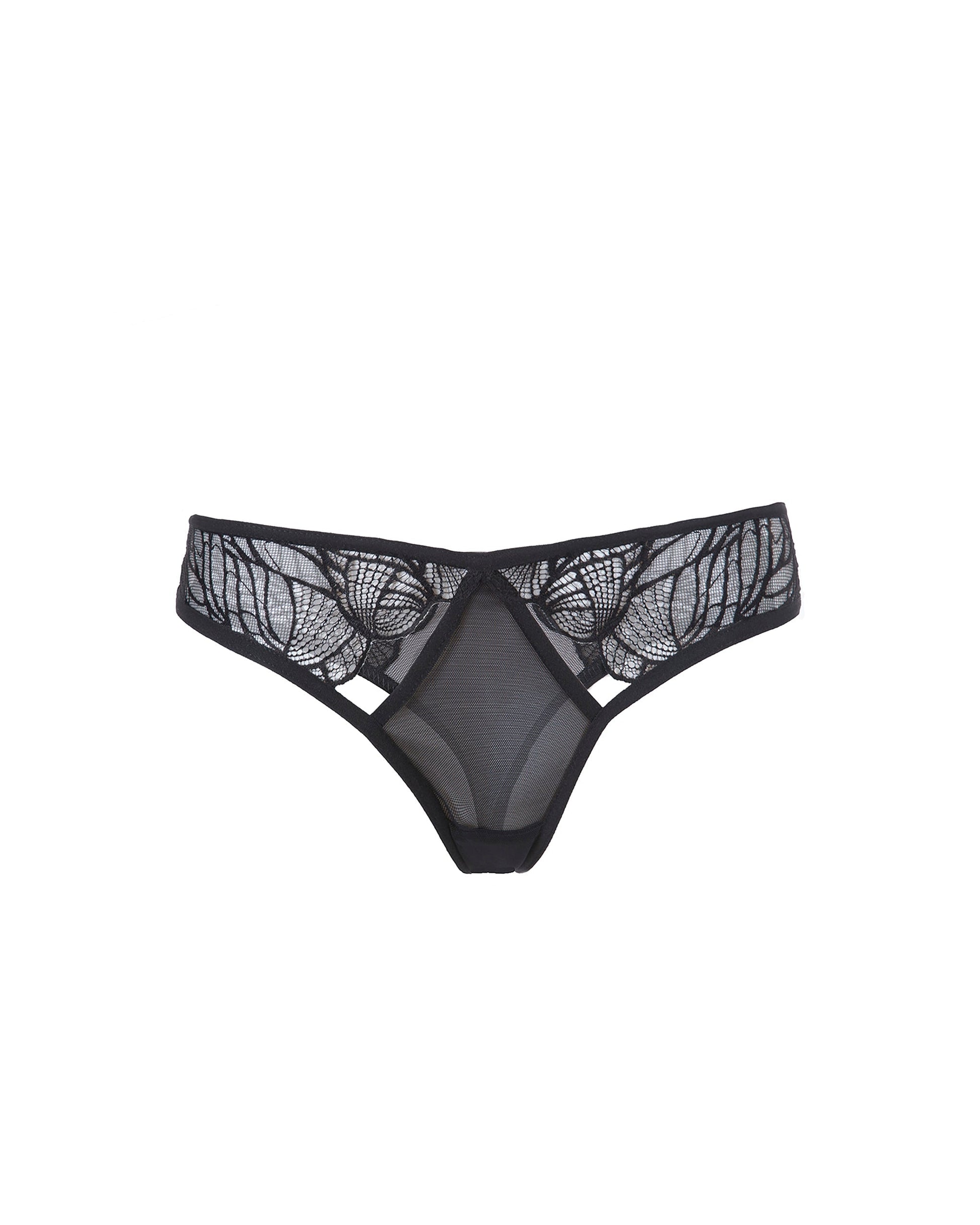 Sexy lace and mesh thong that styles beautifully with the Emerson bra.  Lace panels on the front and back of the thong add to the luxurious styling of this seductive range.