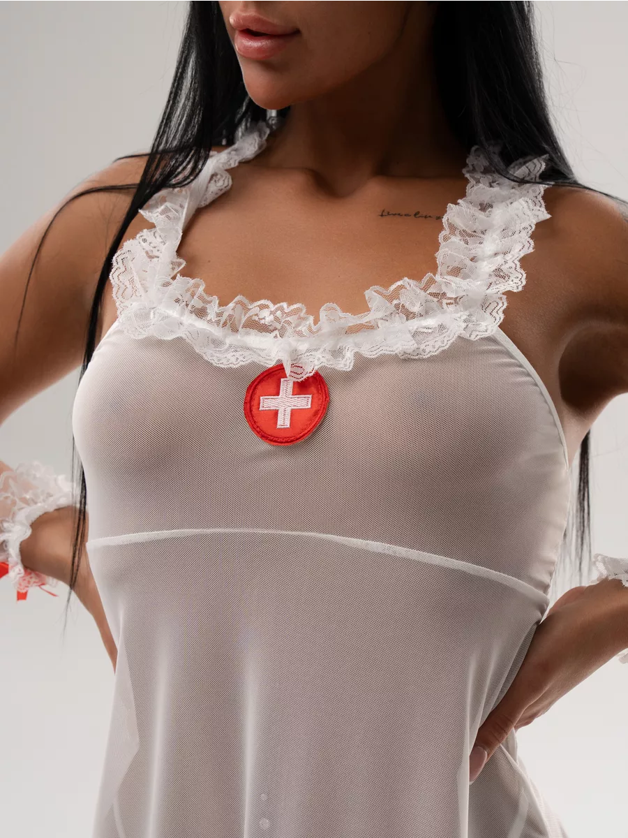 Step into the role of a seductive caregiver with the FancyStar™ After-Hours Angel nurse cosplay set. Designed to ignite passion and playfulness, this sheer white mini dress features delicate lace trim, ruffled shoulder straps, and a bold red cross emblem for an irresistible fantasy look. The lightweight, figure-hugging fabric drapes elegantly, enhancing your curves while offering a teasingly sheer finish.