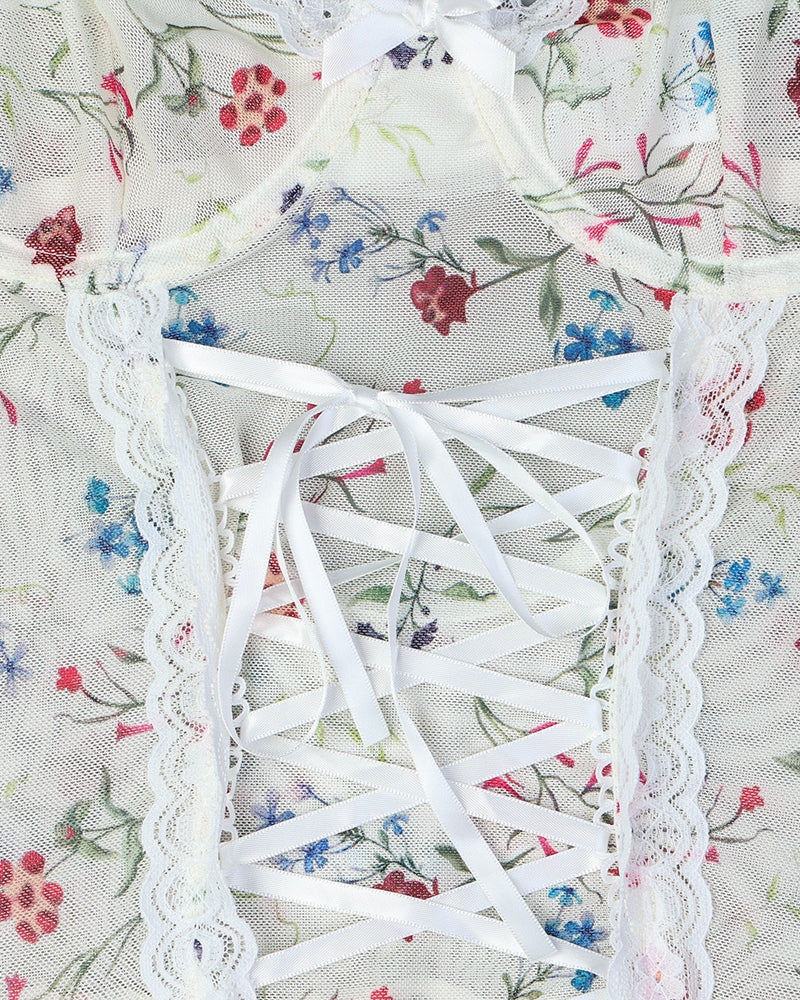 Floral Lace Stitching Stretch Mesh Sexy Pajamas and Stockings Set
