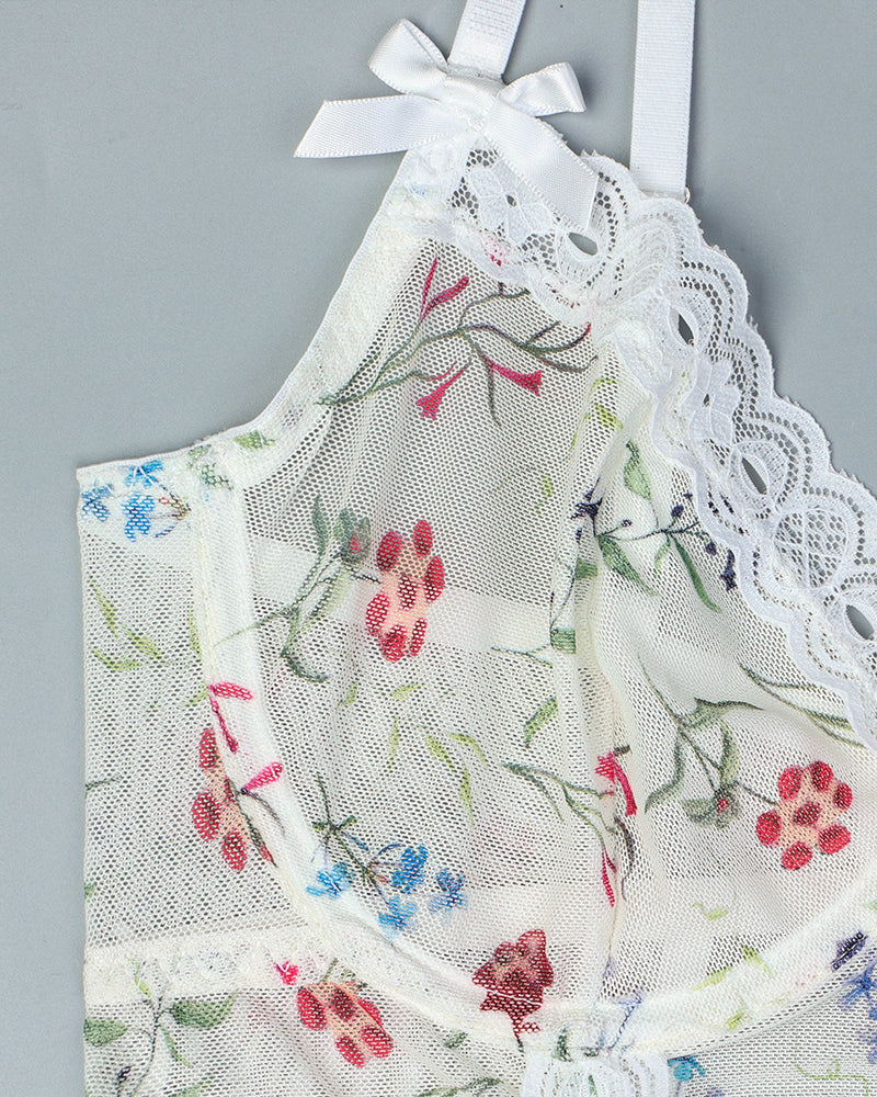 Indulge in delicate allure with this enchanting pajama set, featuring intricate floral lace stitching on lightweight stretch mesh. Designed to hug your curves with feather-soft comfort, this ensemble includes a matching pair of sheer stockings for a perfectly coordinated look. The balance of feminine detailing and sensual transparency creates an elegant yet provocative vibe—perfect for romantic moments or luxurious lounging.