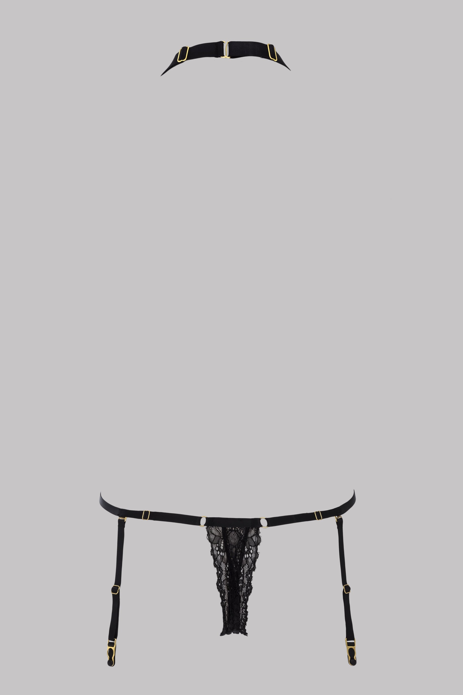 Stretch floral lace thong bodysuit. Adjustable halterneck design that can be opened at the neck. Thong that opens from front to back. Adjustable elasticated waistband. Four removable, adjustable suspenders with gold accents.