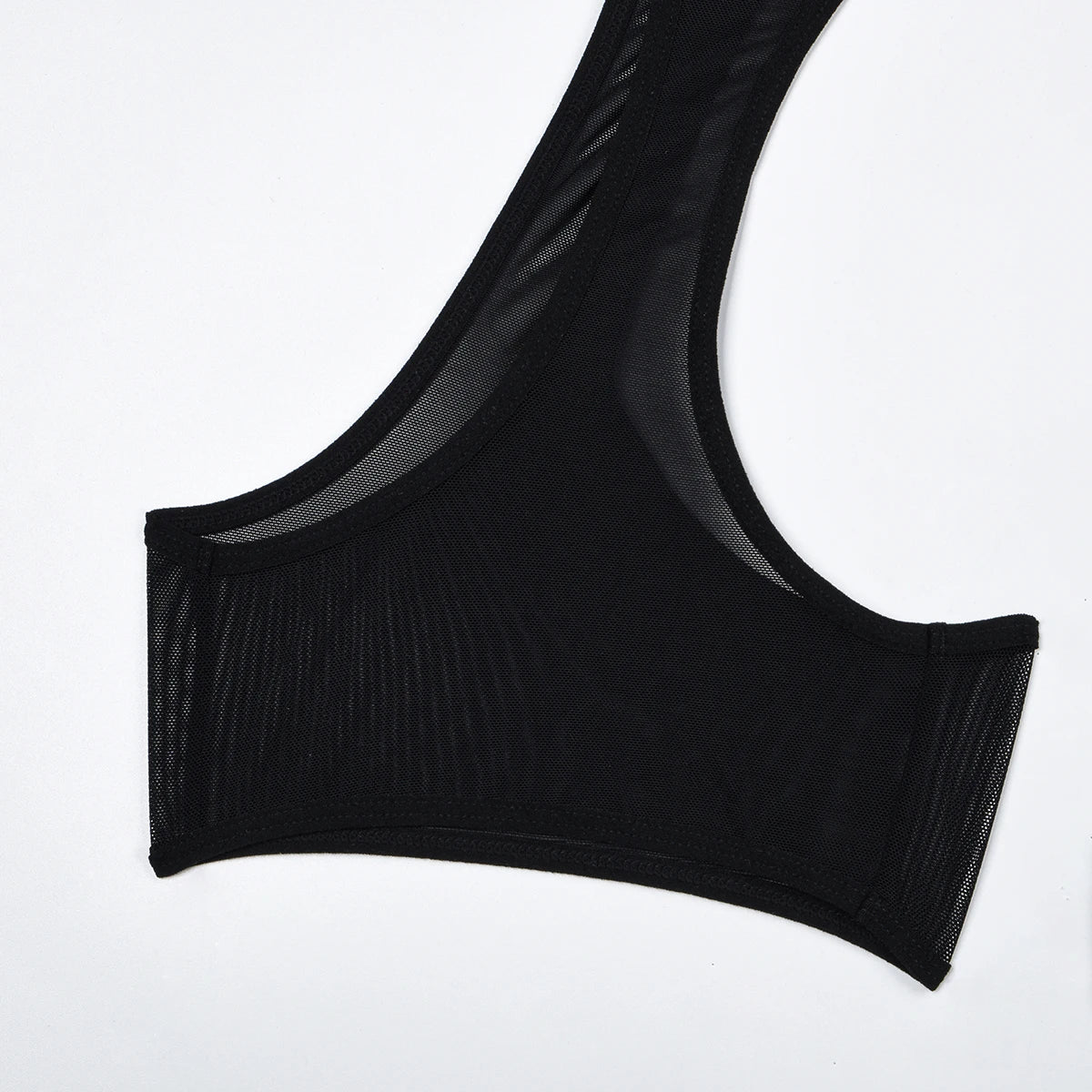 The Modern Noir Mesh Lingerie Set offers a contemporary twist on classic allure. With its sleek black mesh and bold structural elements, this set is designed for the modern woman who values both style and comfort. The innovative use of straps and cut-outs accentuates curves while maintaining an air of mystique and sophistication.