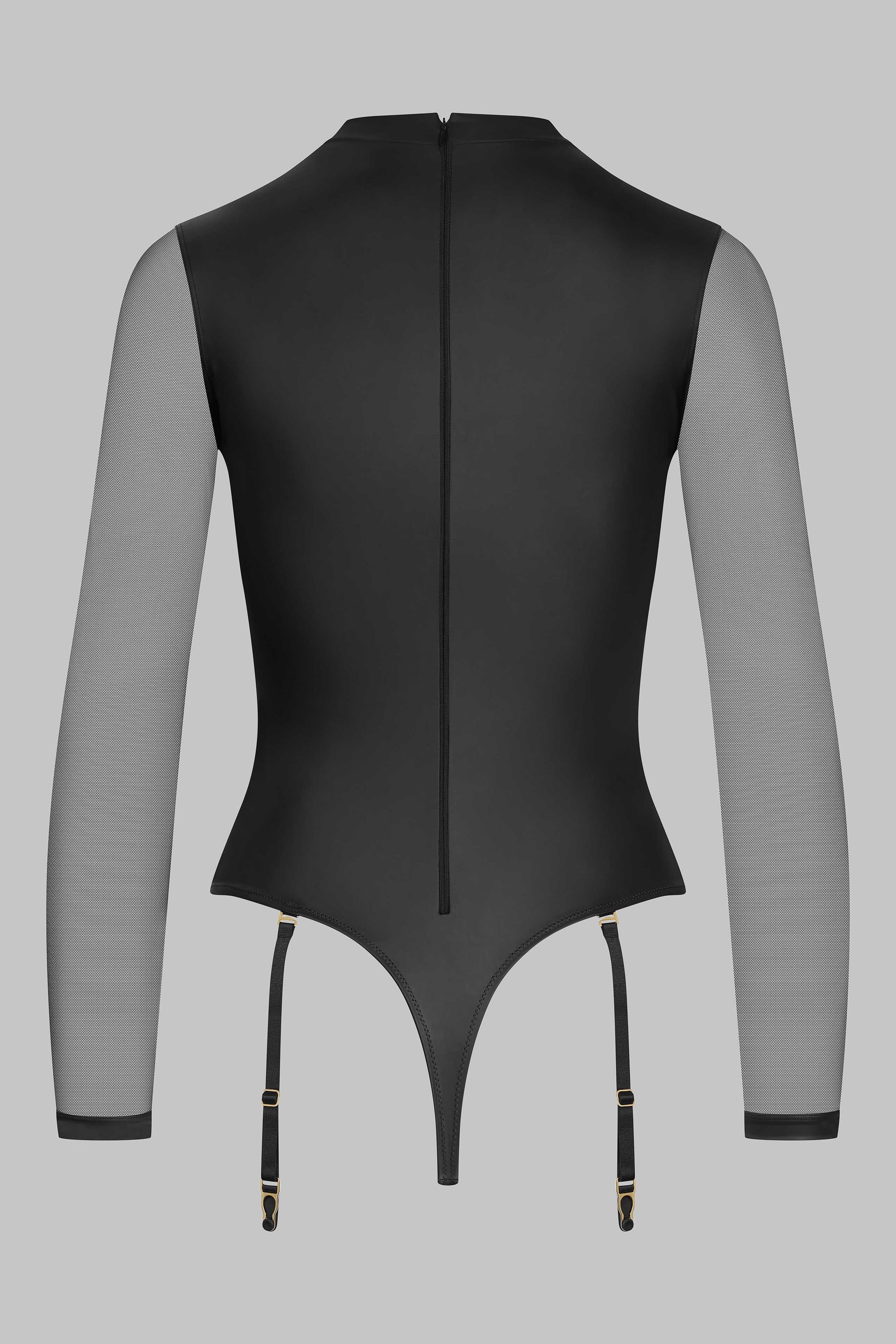 Matte leather effect and sheer tulle long sleeve G-string bodysuit  Opens at the back with a tone-on-tone zip. 4 adjustable and removable suspender straps with golden ornamental trims. The collection's signature "feti-chic" ring embellishes the neck, inviting you to attach it.