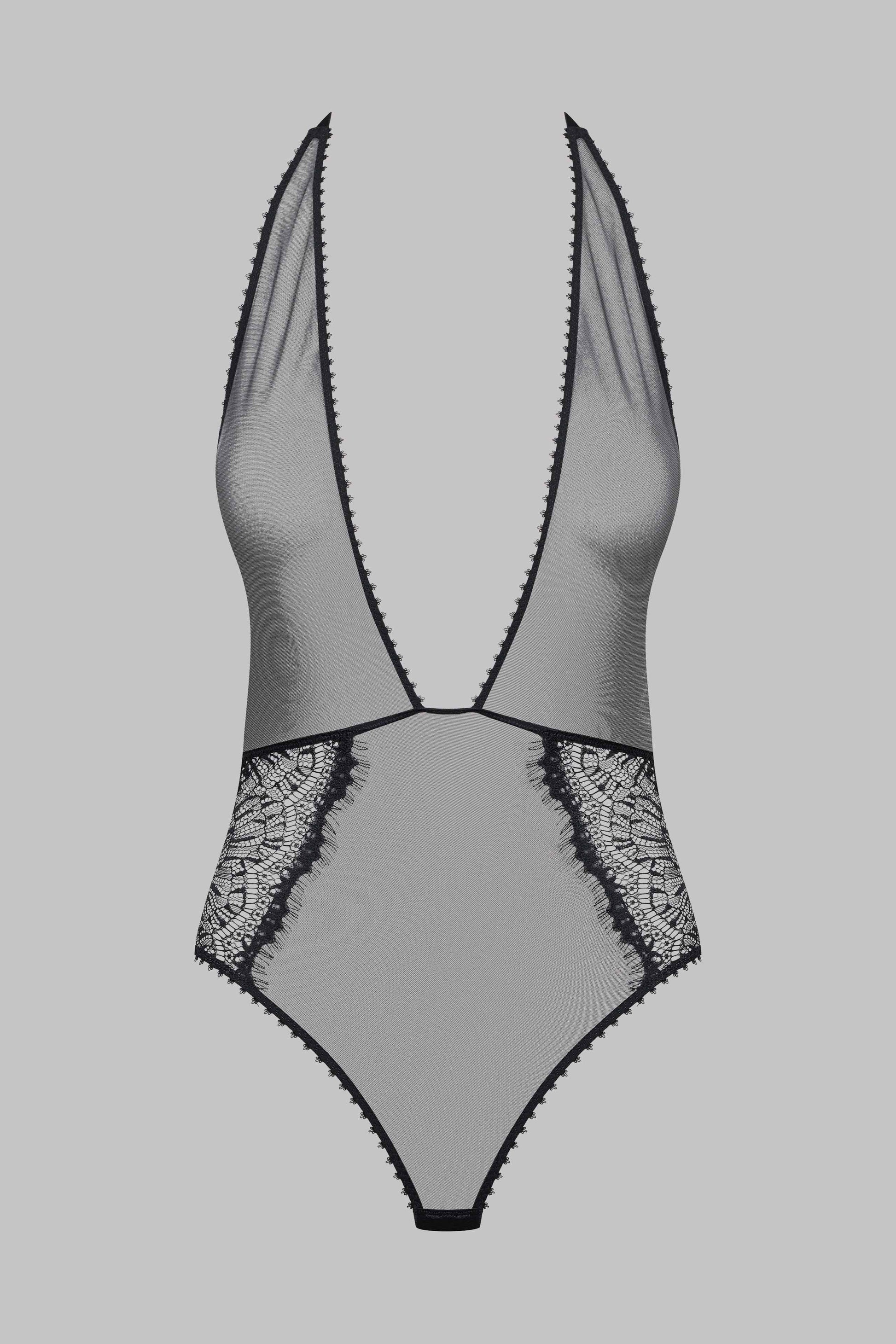 Body string in recycled lace. Shape combining an eyelash lace with see-through tulle edged with picot elastic. A graphic cut that accentuates the silhouette with its deep V neckline and bare back. Adjustable elastic fastening and a gold-tone fastener at the neck. Can be opened and adjusted at the crotch.
