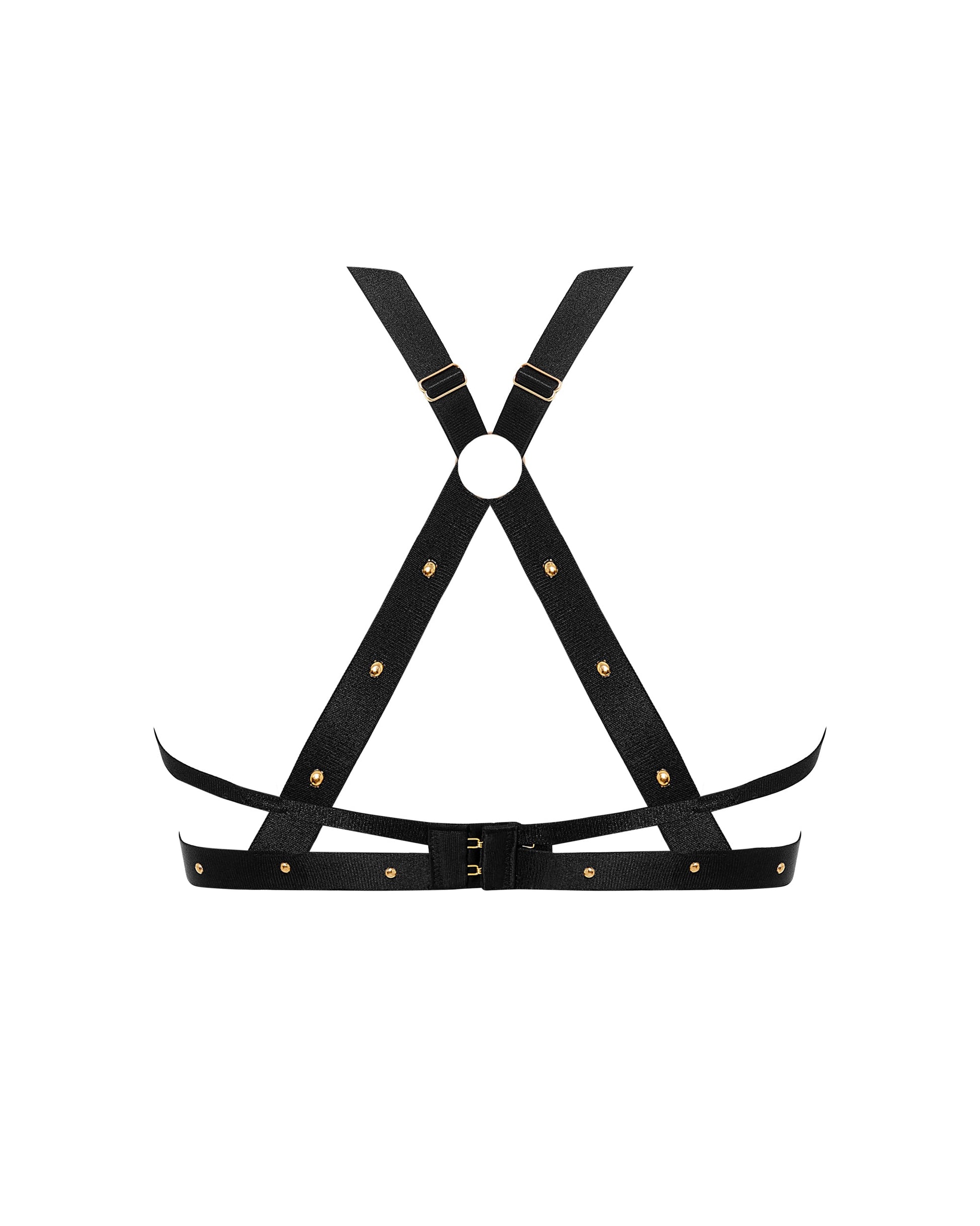 The SANA Open Strappy Top in black features a bold harness bra design with underwiring and a raised centre gore for support and subtle lift. This leather-look bra is constructed with premium elastic strapping that is adorned with gold-tone studs and ring hardware. Adjustable cross-back straps and a rear hook and eye fastening complete this statement piece. Pair with the matching briefs, cuffs and thigh harness for the full look.