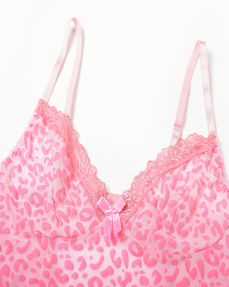 Sexy Deep V Flocked Leopard Print See-Through Mesh Bodycon Nightgown