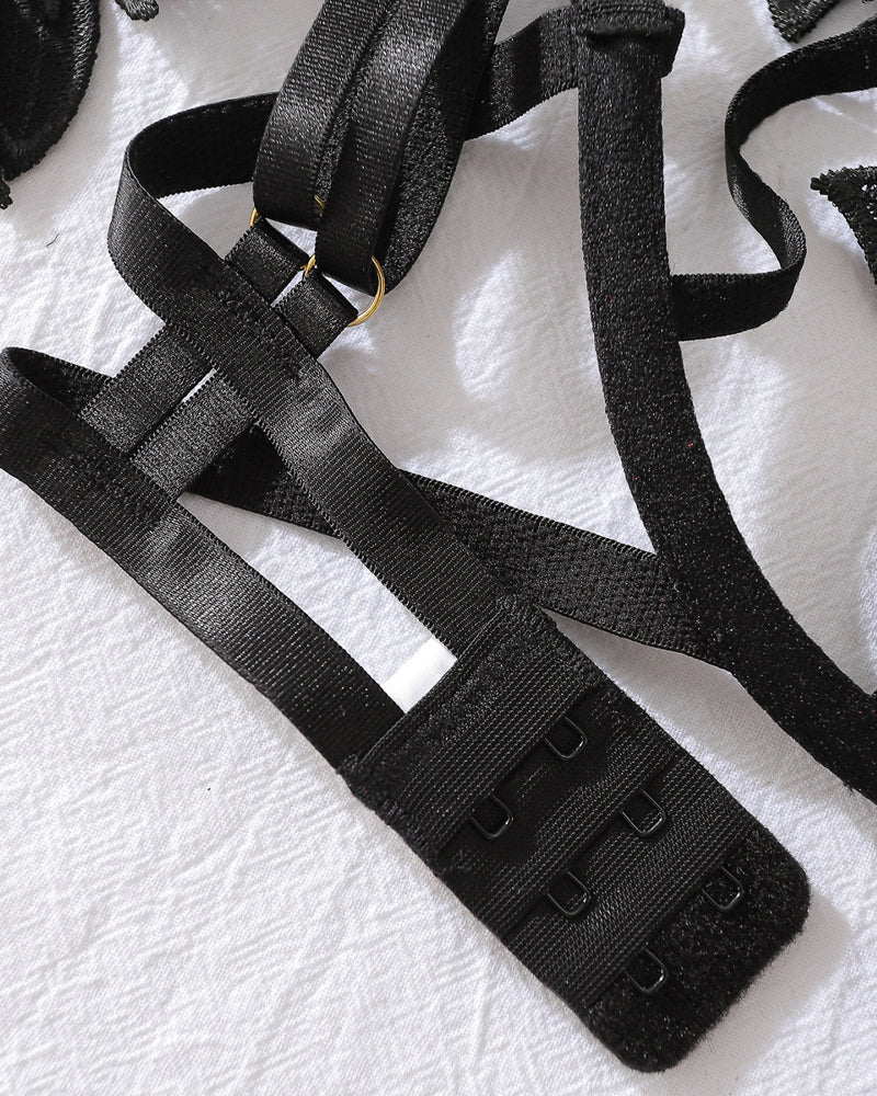 Featuring intricate floral embroidery artfully positioned over sheer mesh panels, this set creates a captivating play of conceal and reveal. The bold heavy-craft chain accents and matching bracelet add a touch of modern glamour, while the strategic cut-outs and seamless construction sculpt your silhouette for a flawless, confidence-boosting fit. Perfect for making an unforgettable statement.