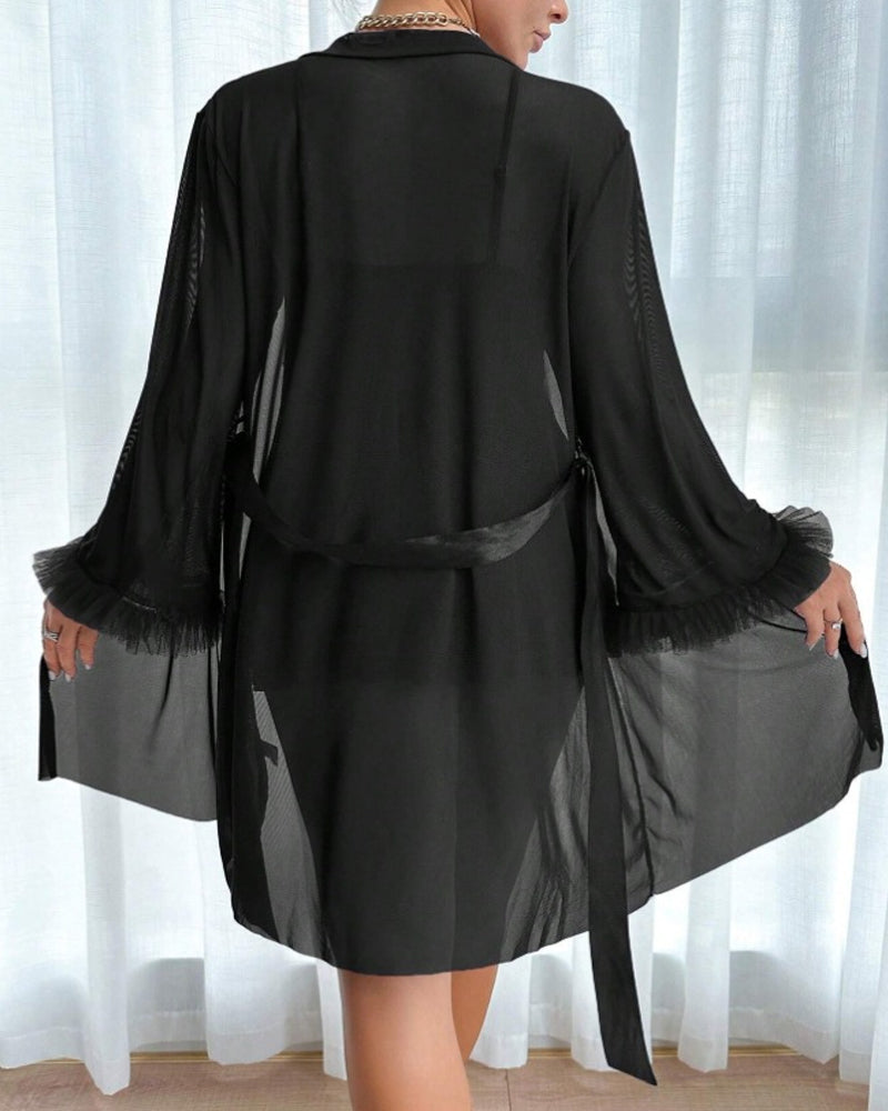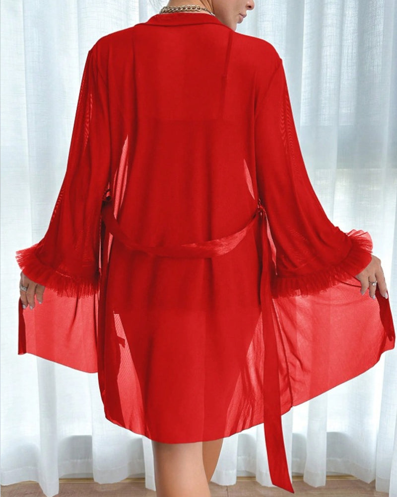 Complete the Ensemble:The knee-length robe, made from the same delicate lace and mesh, ties at the waist for adjustable coverage and dramatic flair.