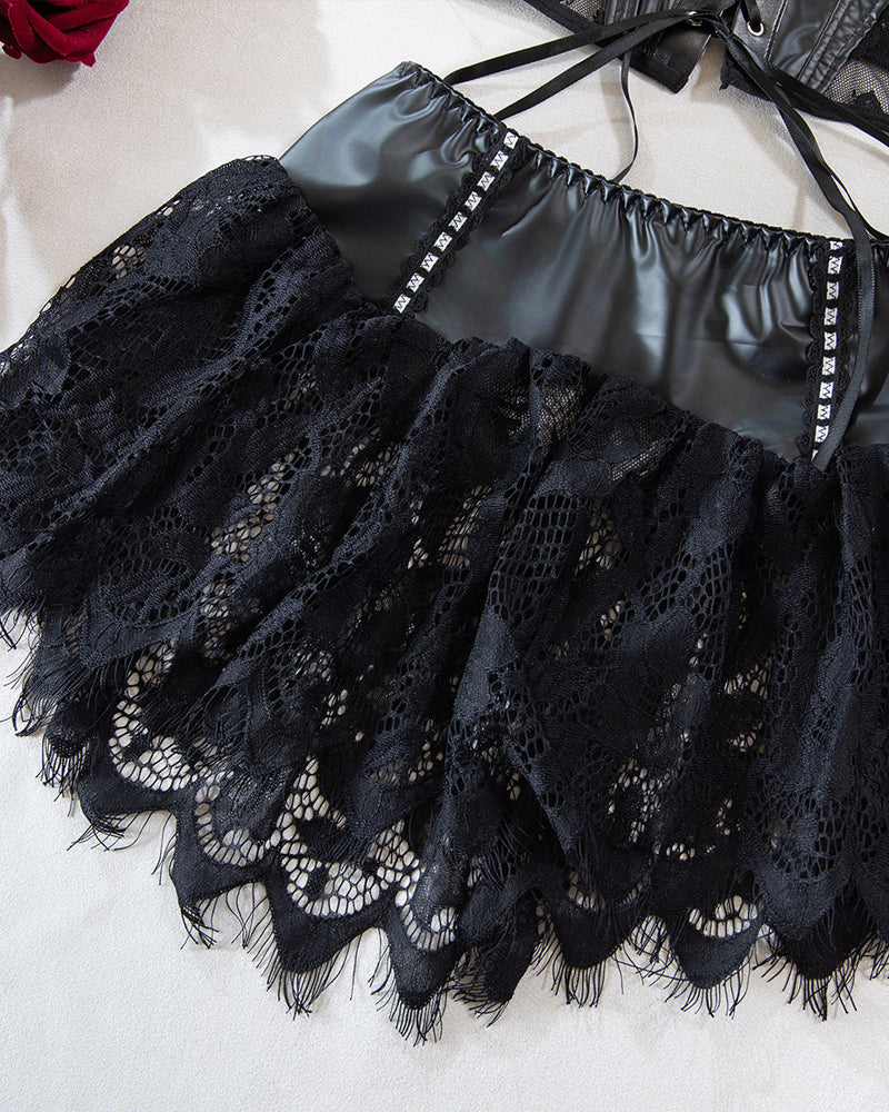 Sexy PU Leather Stitching Lace See-through Strappy Lingerie Set