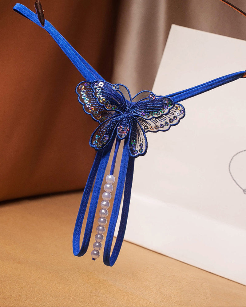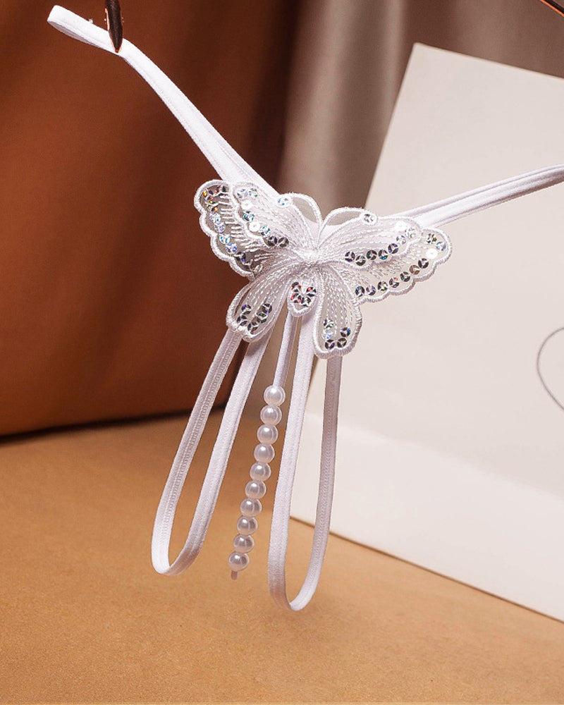 Sexy Sequin Butterfly Embroidered Open Crotch Massage Pearl Thong