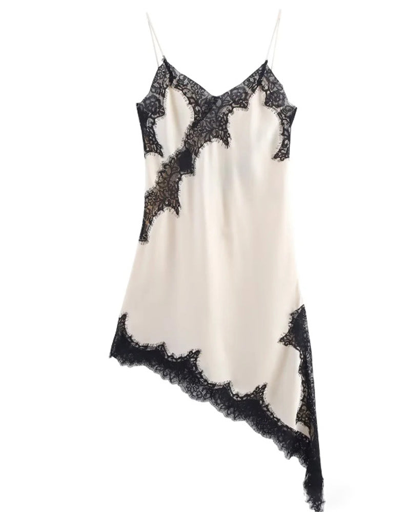 Sexy V-neck Ice Silk Lace Patchwork Asymmetrical Casual Suspender Mini Dress
