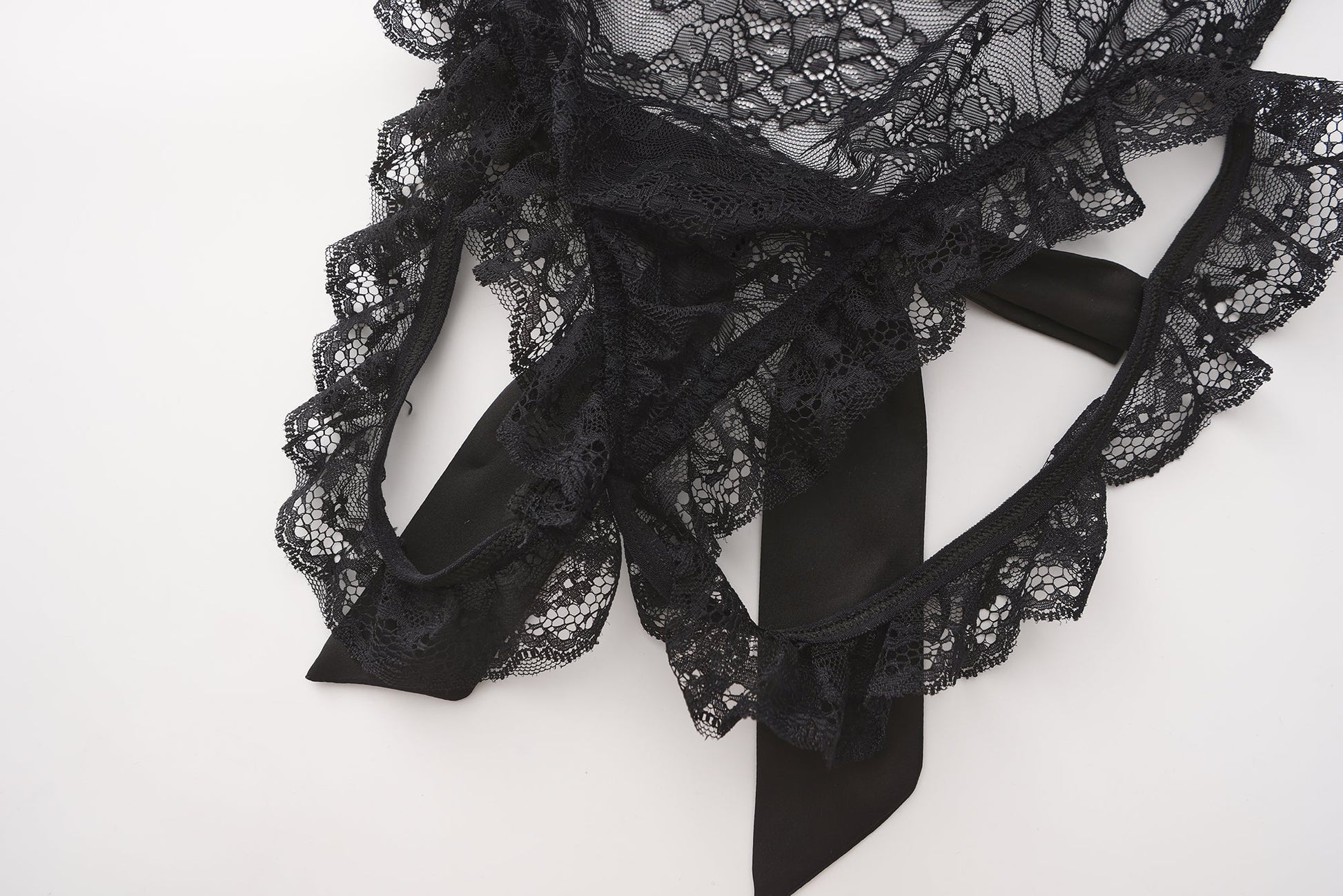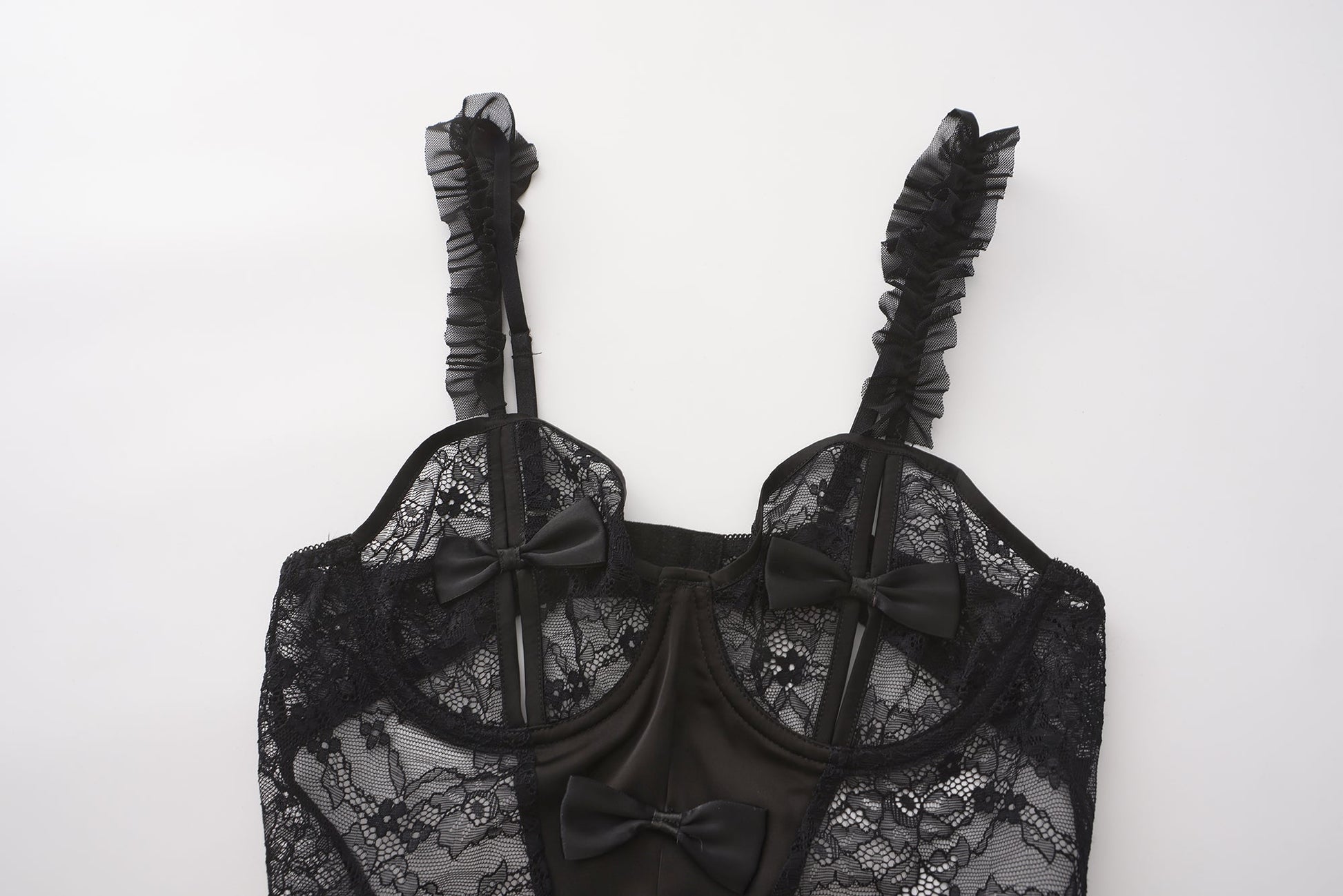 This sheer black lace bodysuit blends floral mesh and satin accents in a fitted silhouette. Ruffle straps and bow details add structure and texture to the transparent body, while the cutout front and open back define the piece’s character. The soft scalloped edges outline the legs and neckline, creating a clean, balanced shape.