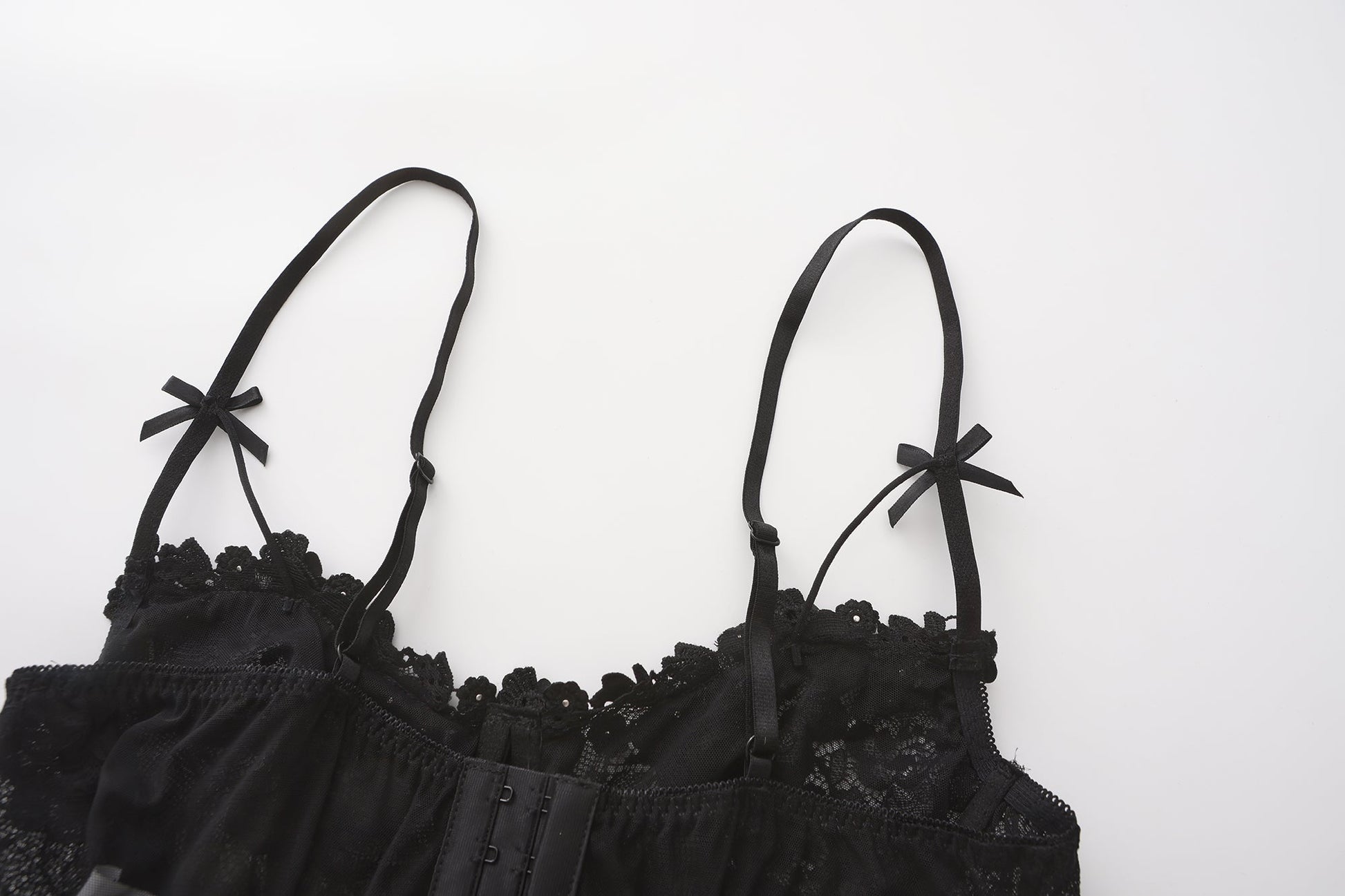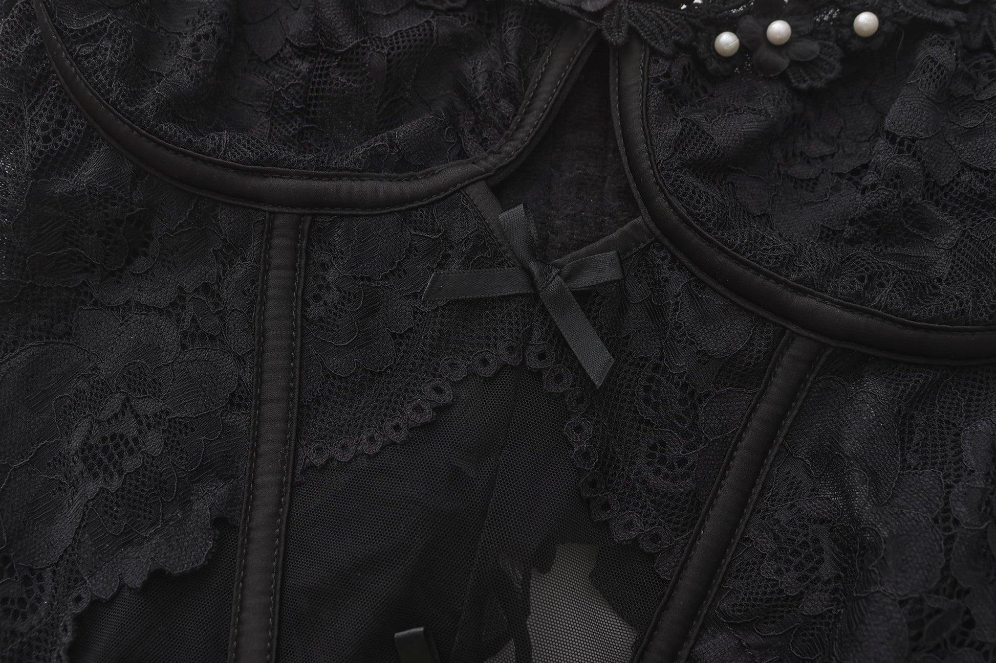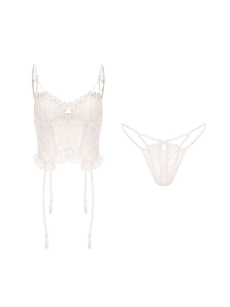 This pearl lace corset lingerie set brings together intricate lacework and delicate embellishments for a refined yet sensual look. The underwired corset with structured boning enhances the silhouette, while the sheer floral lace creates an alluring effect. Adjustable spaghetti straps with satin bow details ensure a personalized fit, complemented by ruffled lace trim at the waist. The garter straps offer adjustable length, making them easy to pair with stockings. A matching lace thong completes the ensemble with delicate strappy details. The included lace choker with a bell accent adds an extra touch of charm, making this set perfect for intimate moments or special occasions.
