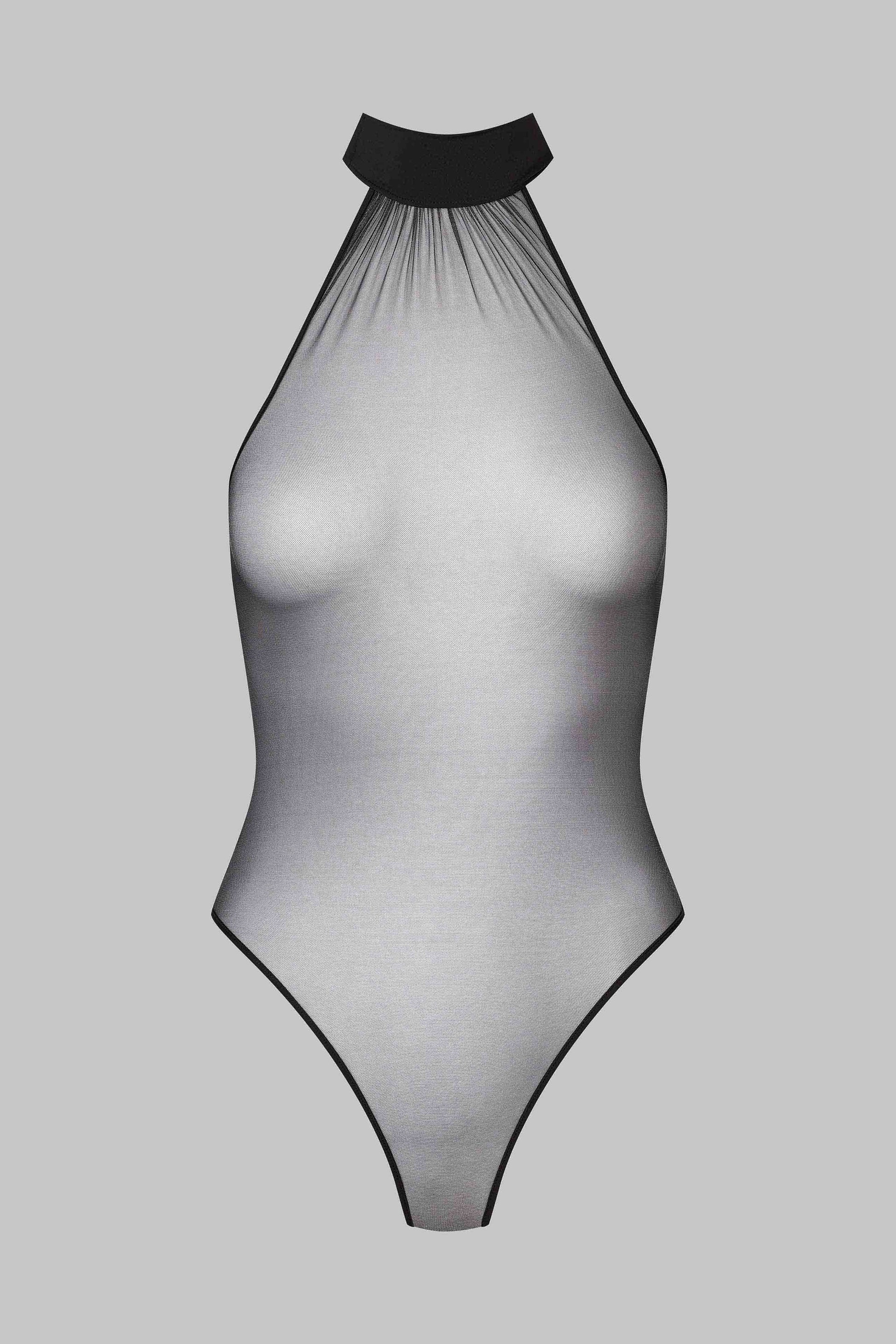 Sheer thong bodysuit with american neckline. On the front, folds of tulle delicately dress the cleavage. On the back, they follow a seam to the hollow of the waist. The opaque material high collar opens with a gold jewellery hook. Adjustable closure with a smooth and fine hook at the crotch.