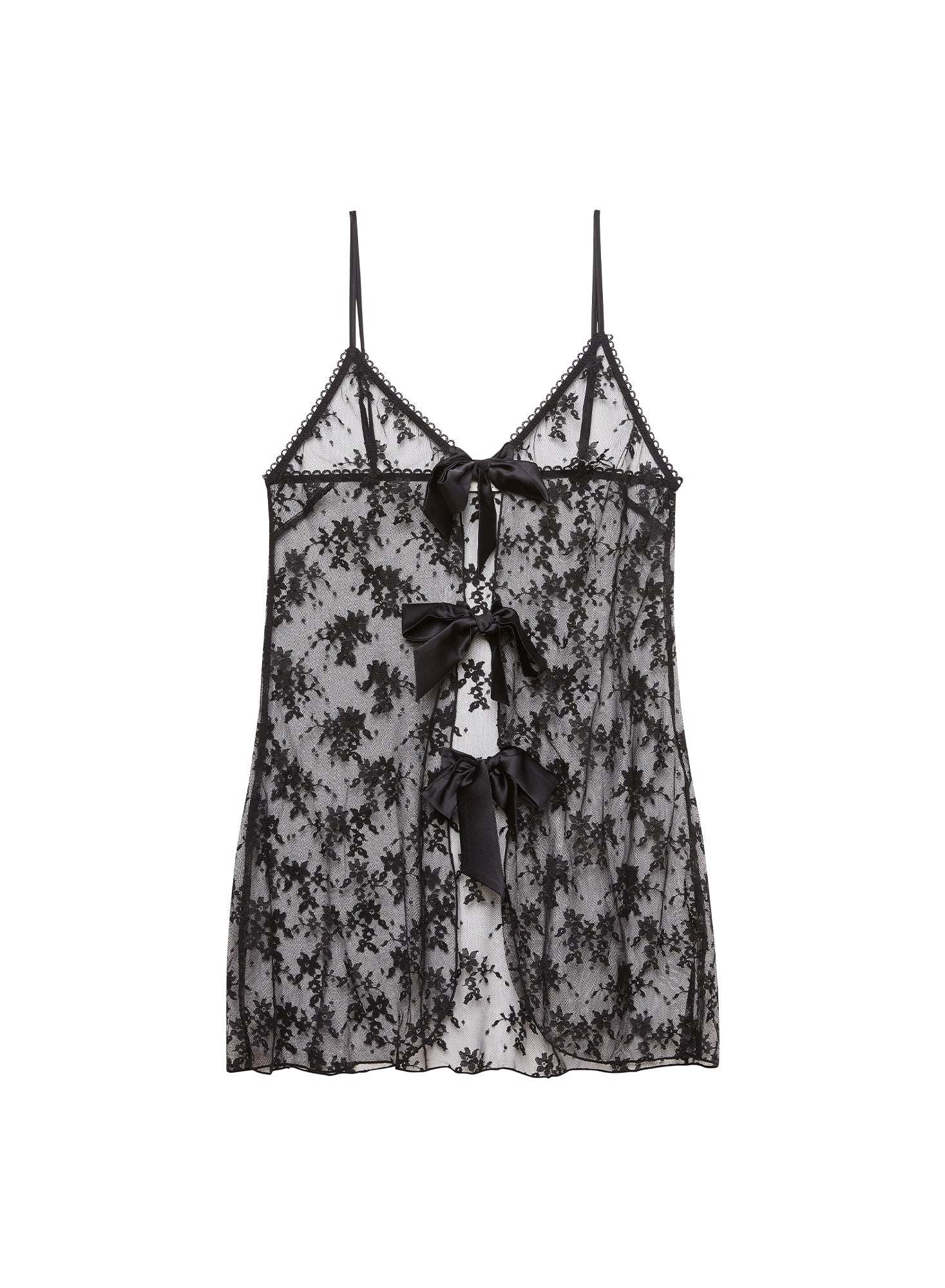 Romance me. Our Untie Me Nightie, cut from stunning stretch lace with flirty picot trim and lush silk tie front. Untie the bow and watch the garment fall off the body. Adjustable silk straps. Pair with the matching Untie Me Thong or Cheeky.